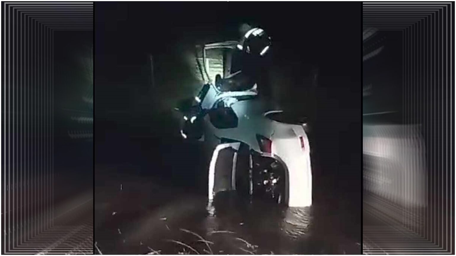 Al llegar al lugar, los agentes encontraron un vehículo volcado sobre su lateral izquierdo, parcialmente sumergido en el agua. Una mujer en el lugar informó a los oficiales que su esposo estaba atrapado dentro del vehículo.
