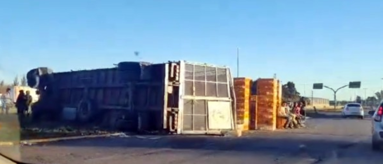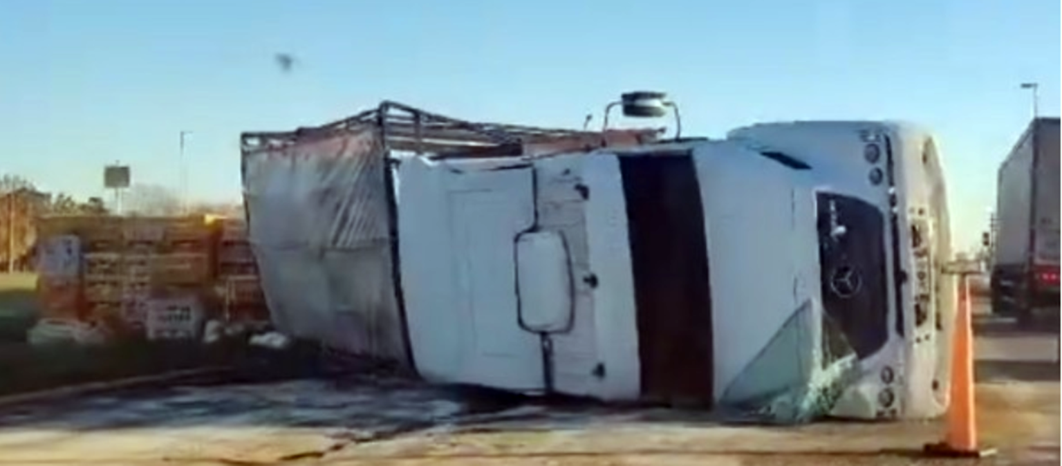 Este lunes un camión Mercedes Benz cargado con cajones de pollos volcó en el límite entre los distritos de General Rodríguez y Luján, cerca del Acceso Oeste.