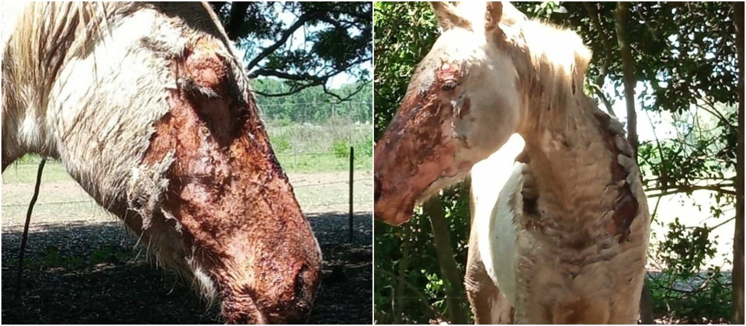 Expresaron que el equino estuvo muchísimo tiempo sin atención veterinaria, al rayo del sol y el maltrato animal esta consumado. Hay muchos relatos de como llegó a ese estado, pero se ve claramente que el animal esta sufriendo, sin tratamiento y con la dermis expuesta.