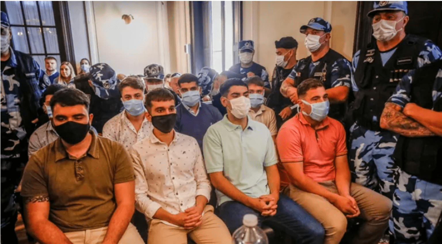 Los acusados, Máximo Thomsen, Enzo Comelli, Matías Benicelli, Blas Cinalli, Ayrton Viollaz, y Luciano, Ciro y Lucas Pertossi se presentaron con barbijos en el Tribunal n° 2 de Dolores y esa circunstancia llamó la atención en general.