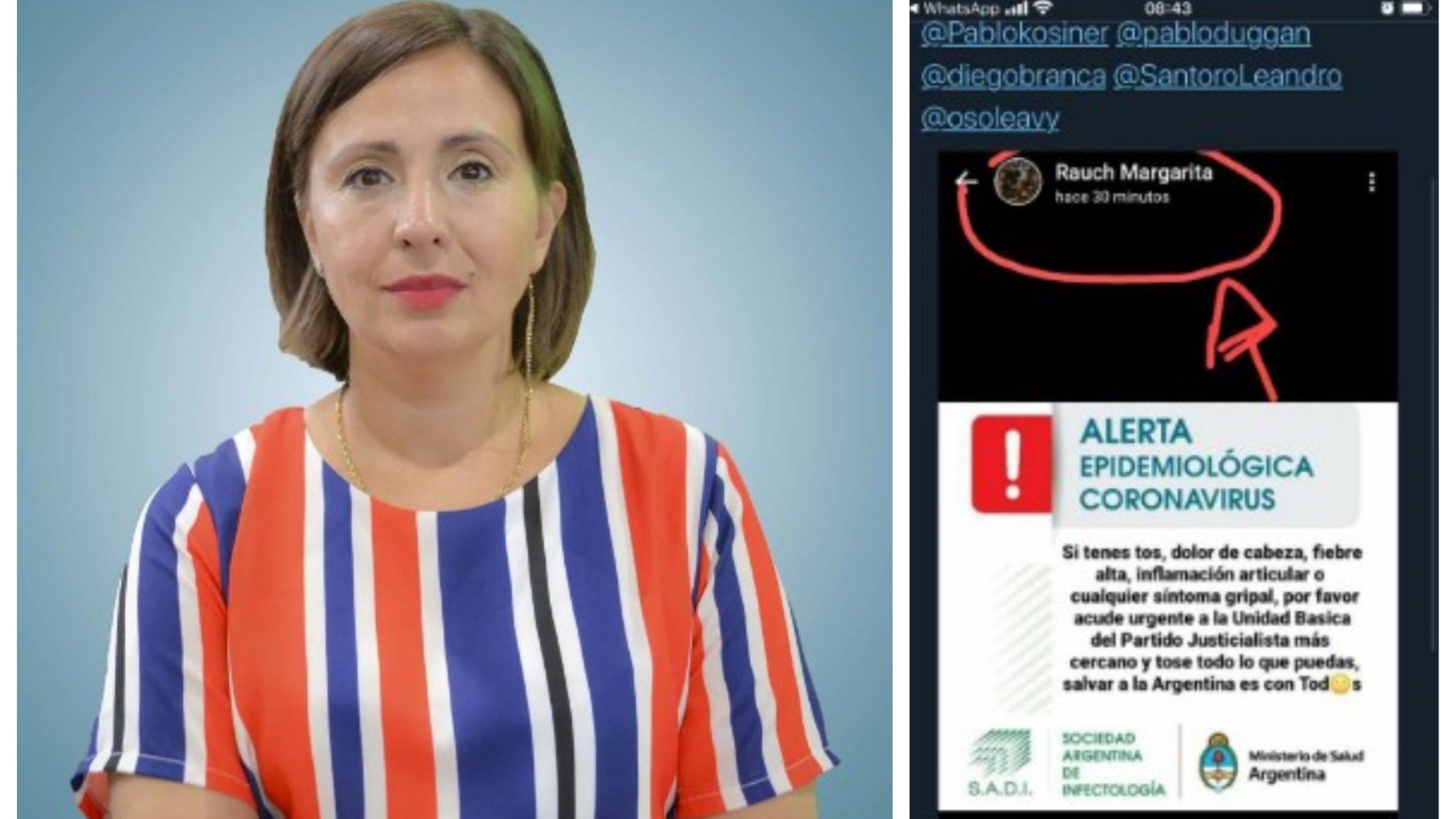 “Si tenés dolor de cabeza, fiebre alta, inflamación articular o cualquier síntoma gripal, por favor acude a la Unidad Básica del Partido Justicialista más cercano y tose todo lo que puedas, salvar a la Argentina es con todos”, dice la imagen que compartió la secretaria Margarita Rauch por sus redes sociales.