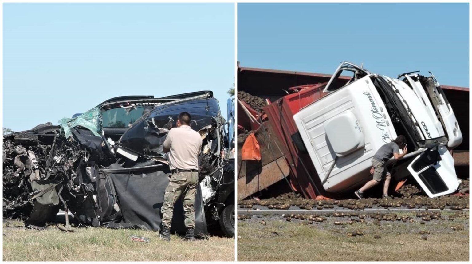 En el sitio indicado chocaron frontalmente una camioneta Toyota Hilux y un camión que transportaba papa a granel, el cual producto de ello volcó y desperdigó gran parte de su carga sobre la ruta.