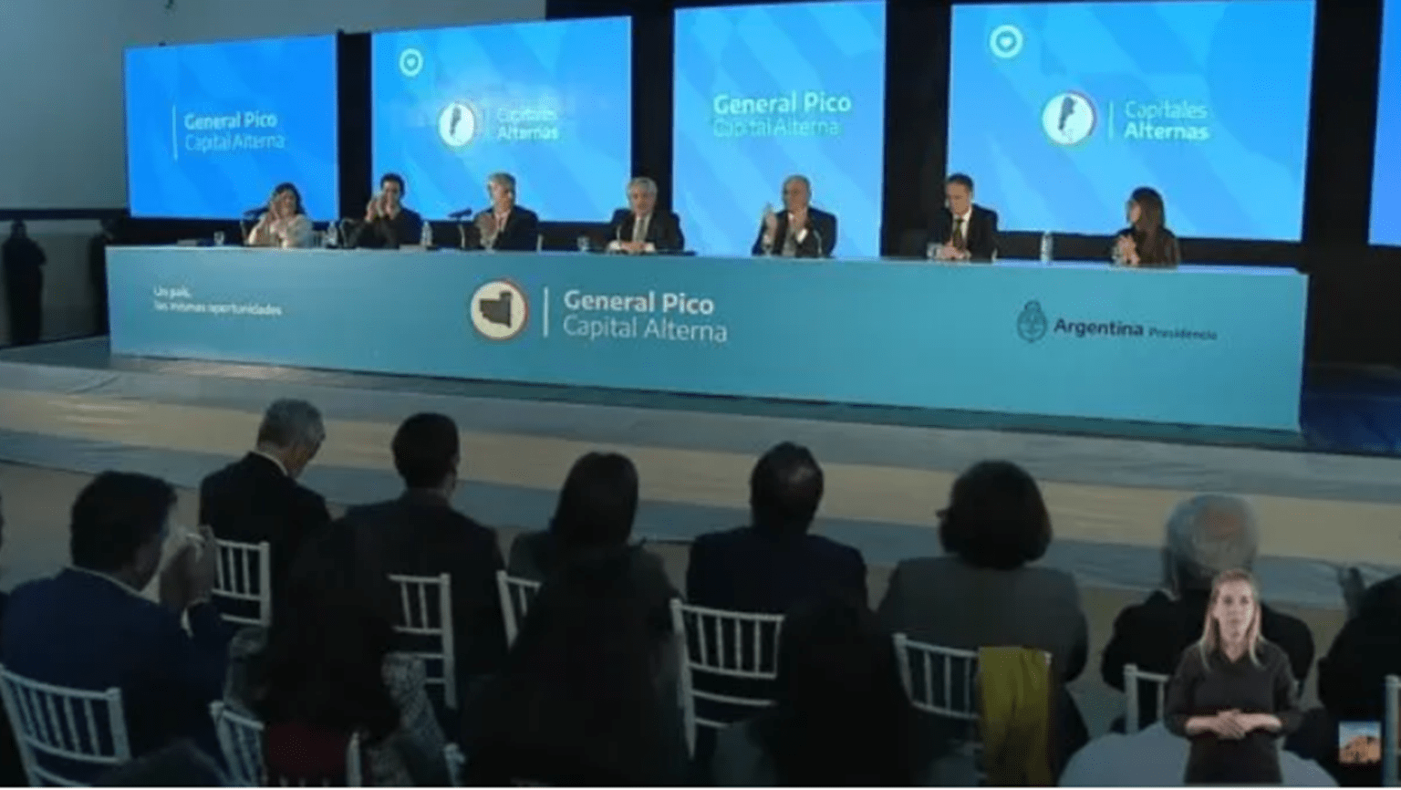 El acto del gabinete federal del programa Capitales Alternas se realizó hoy en General Pico, en la provincia de La Pampa, acompañado por el jefe de Gabinete, Juan Manzur; los ministros del Interior, Eduardo De Pedro; y de Obras Públicas, Gabriel Katopodis y el gobernador de La Pampa, Sergio Ziliotto.