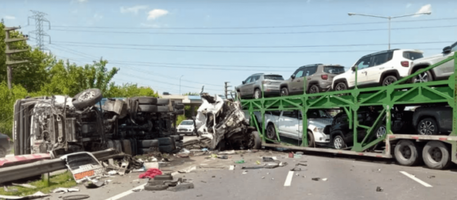 Según las autoridades viales, el choque entre los dos vehículos provocó que uno de ellos volcara y quedara fuera de la traza de la autopista, mientras que el otro camión, que transportaba autos, quedó cruzado en la vía, bloqueando completamente el tránsito.