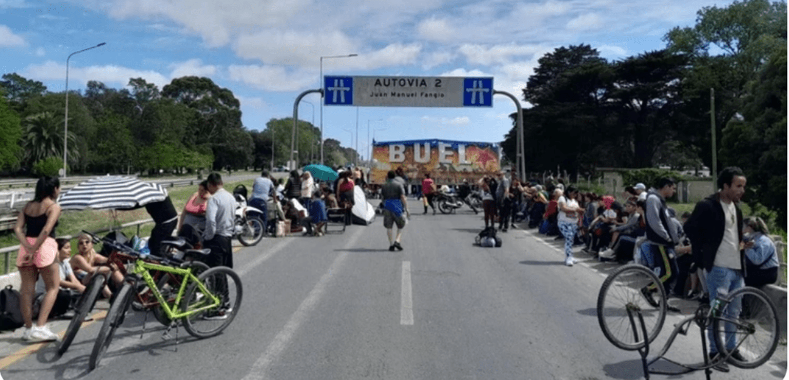 Integrantes del Movimiento Teresa Rodríguez (MTR), Barrios Unidos en Lucha y Votamos Luchar llevaron a cabo un corte parcial de tránsito en la autovía 2, en el acceso a Mar del Plata, como parte de una jornada nacional de protestas.