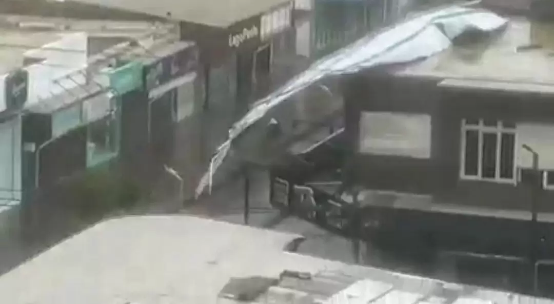 El episodio quedó registrado mediante una cámara de seguridad de un edificio lindero y se puede ver el fuerte impacto de la chapas cayendo sobre la arteria.