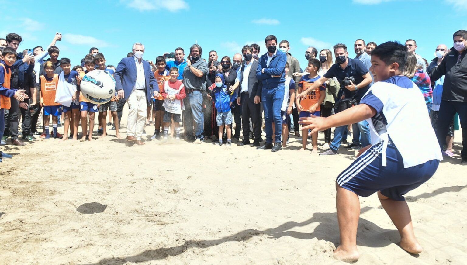 Previo al encuentro con los Intendentes oficialistas de la Quinta Sección, Fernández tuvo oportunidad de jugar unos penales con un integrante del Club Social de Mar de Ajó en la playa deportiva de dicha localidad.