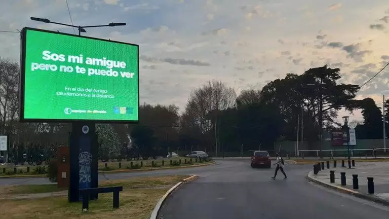 “Sos mi amigue pero no te puedo ver. En el Día del Amigo saludémonos a la distancia”, con este texto amanecieron las vallas de las calles de Buenos Aires este 20 de julio en el Día del Amigo.