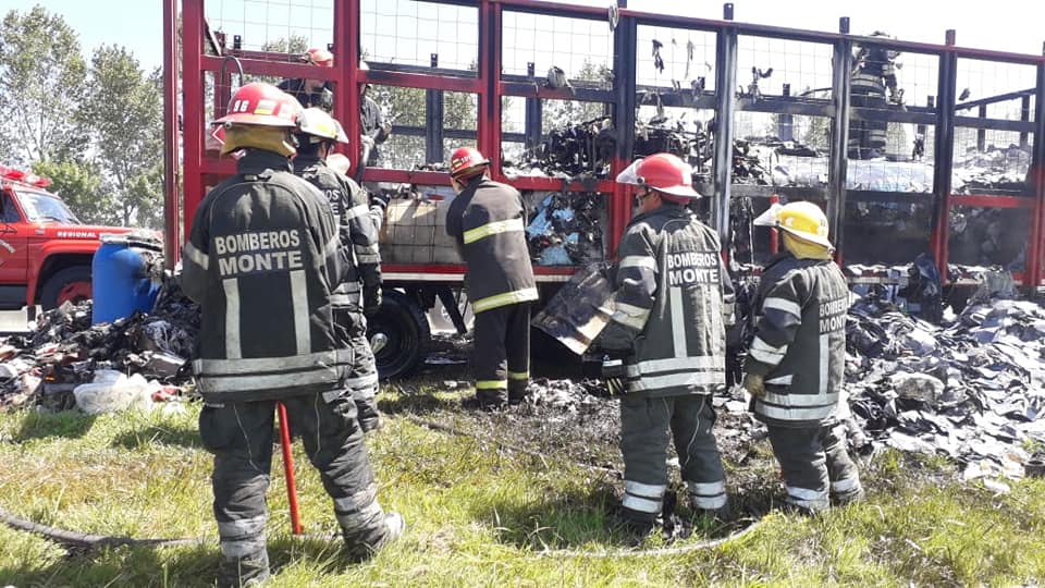 Este mediodía y por causas que se desconocen, se produjo el incendio de un acoplado en cuyo interior transportaban papeles, placas de baterías y bidones con productos peligrosos.