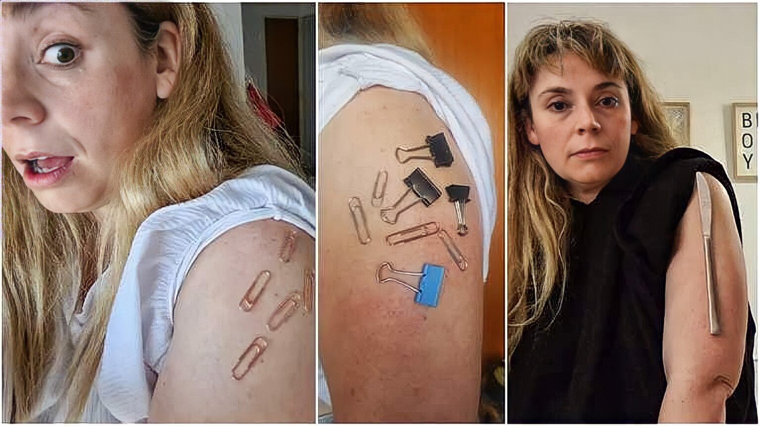 Según relató, su pareja tomó unos clips de oficinas normales y otros tipo mariposa más pesados y se los colocó en el brazo donde la vacunaron; a fines de comprobar si se le quedaban pegados.