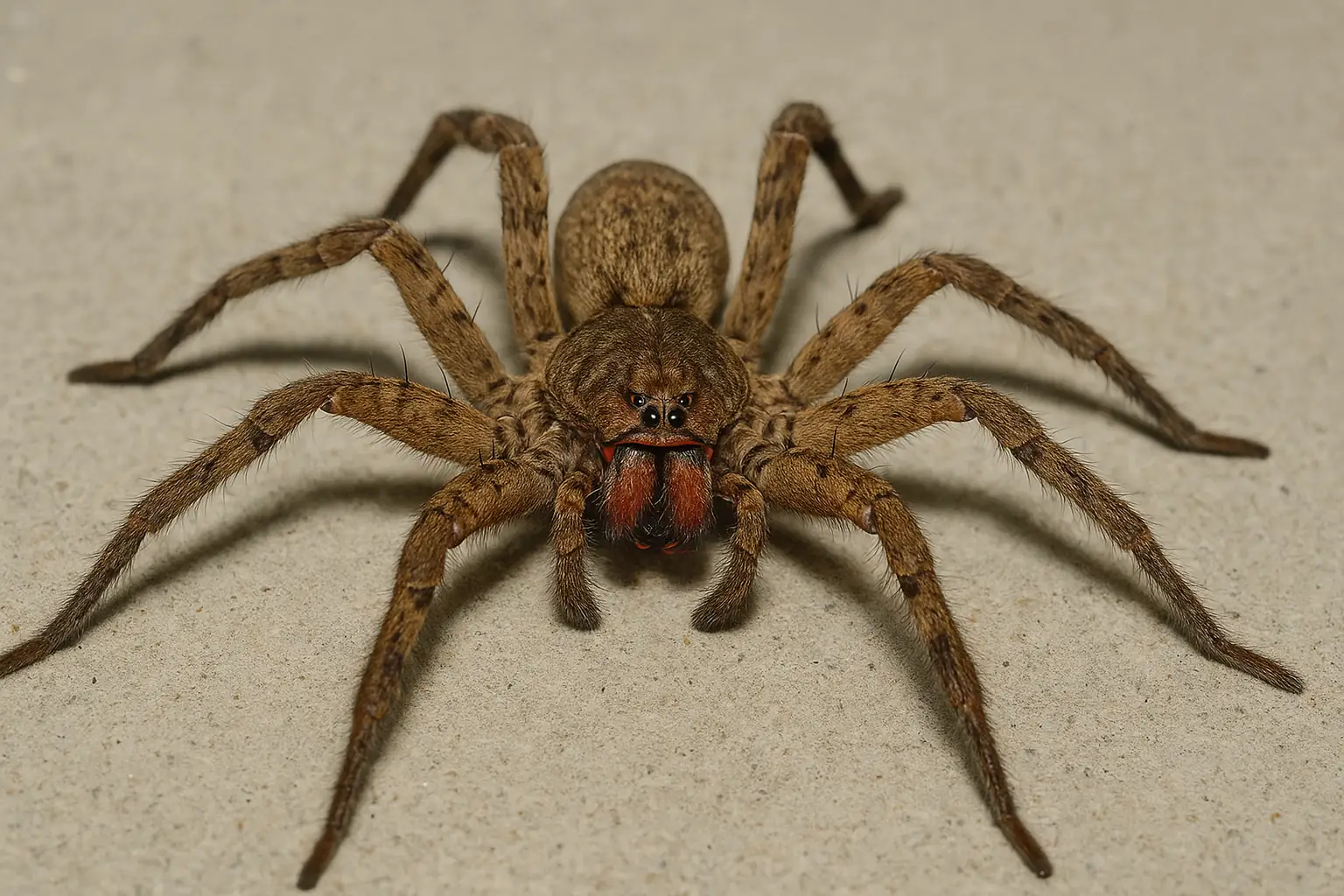 La “araña del banano” es errante y cazadora nocturna: no teje tela, se alimenta de insectos y pequeños vertebrados, y puede alcanzar hasta 15 centímetros con las patas extendidas. Su cuerpo es marrón con manchas claras y oscuras, y se distingue por sus quelíceros rojizos.