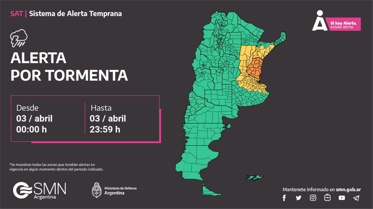 Para hoy, miércoles 3 de abril, se pronostican fuertes tormentas, caída de granizo y vientos en varias localidades bonaerenses. Estas alertas se emiten para fenómenos meteorológicos con capacidad de daño y que puedan interrumpir momentáneamente las actividades cotidianas.
