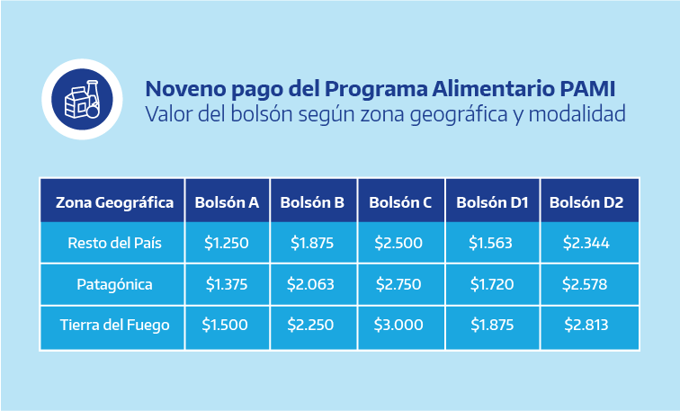 A continuación te compartimos la tabla donde se detalla el valor del bolsón de PAMI según la ubicación geográfica y modalidad. Los montos del programa Alimentario van desde $1250 hasta 3.000 pesos mensuales.