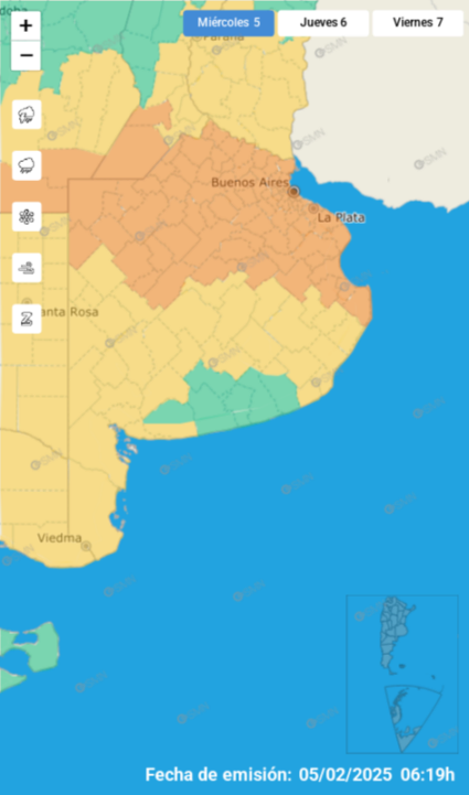 El Servicio Meteorológico Nacional (SMN) ha emitido una alerta naranja y otra amarilla para este miércoles 5 de febrero, debido a la posibilidad de tormentas fuertes, caída de granizo y vientos intensos en varias localidades de la provincia de Buenos Aires.