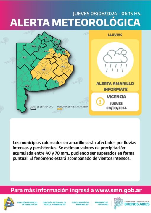 El SMN ha lanzado un alerta amarillo por lluvias que afecta al centro, oeste y la costa de la provincia de Buenos Aires. Este área se verá afectada por lluvias intensas y persistentes, con precipitaciones acumuladas estimadas entre 40 y 70 mm, que podrían superarse en algunas zonas. El fenómeno estará acompañado de vientos intensos, con temperaturas previstas entre 6ºC de mínima y 10ºC de máxima.