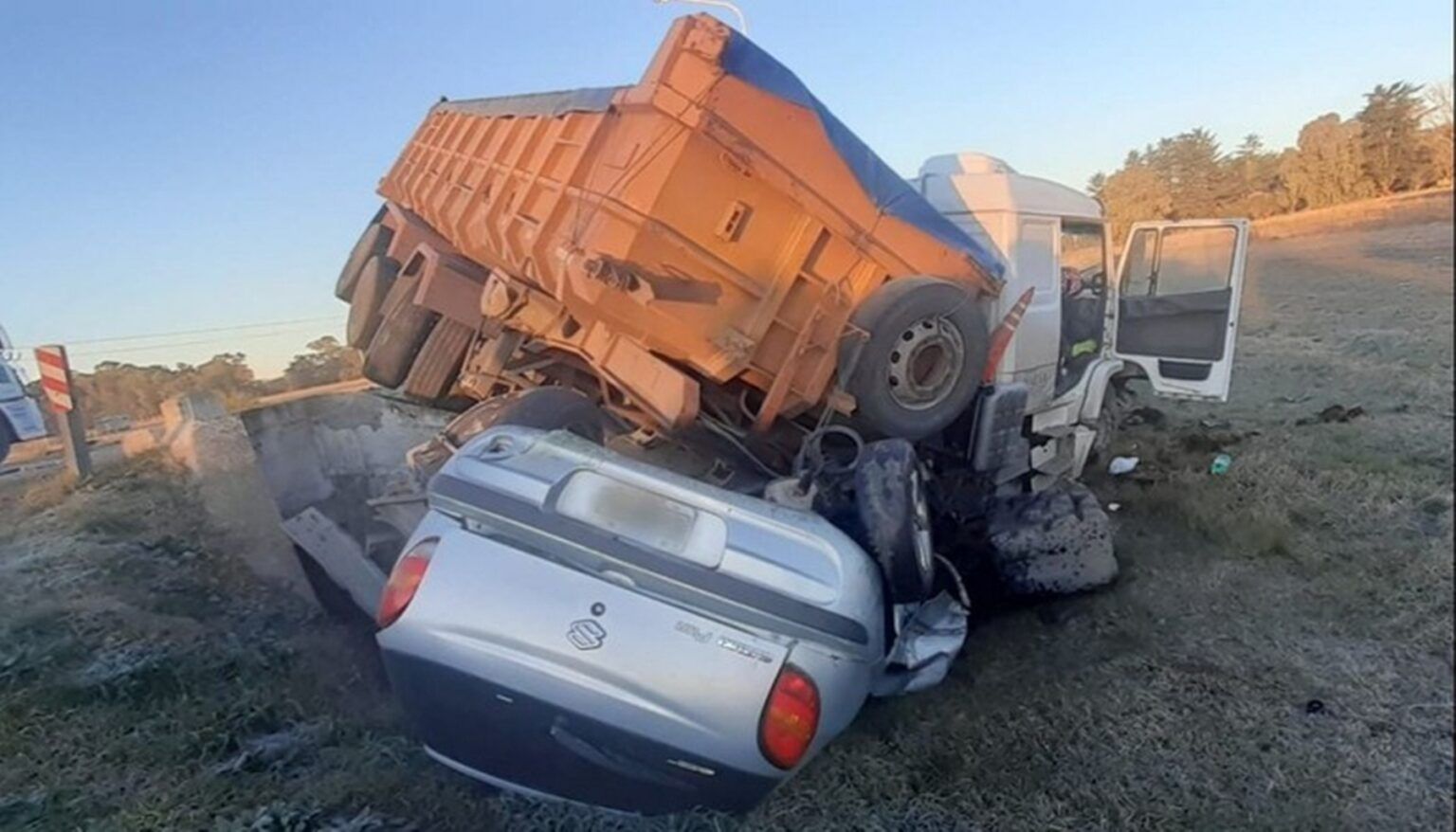 El impactante accidente se produjo entre un camión Mercedes Benz y un auto Suzuki Fun, que producto del impacto terminó en la banquina de la ruta debajo del camión y lamentablemente, su conductor falleció en el acto.