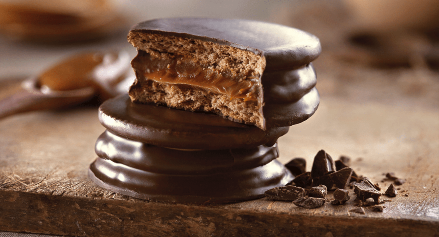 La marca tiene más de 50 años en el mercado argentino y es reconocida por ser la pionera en el formato triple. Su receta es simple: masa de chocolate relleno con dulce de leche.