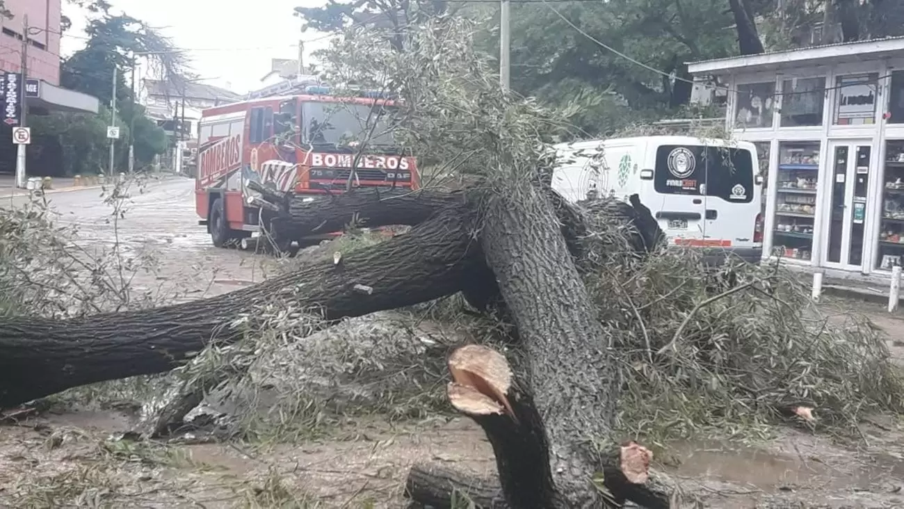 Bomberos Voluntarios, personal de Defensa Civil de cada municipio y cuadrillas de operarios de las respectivas comunas trabajan en la mañana de este domingo en la remoción de árboles y postes caídos, como también en el retiro de cartelería que el fuerte viento destruyó y brindando asistencia a las familias que resultaron damnificadas.