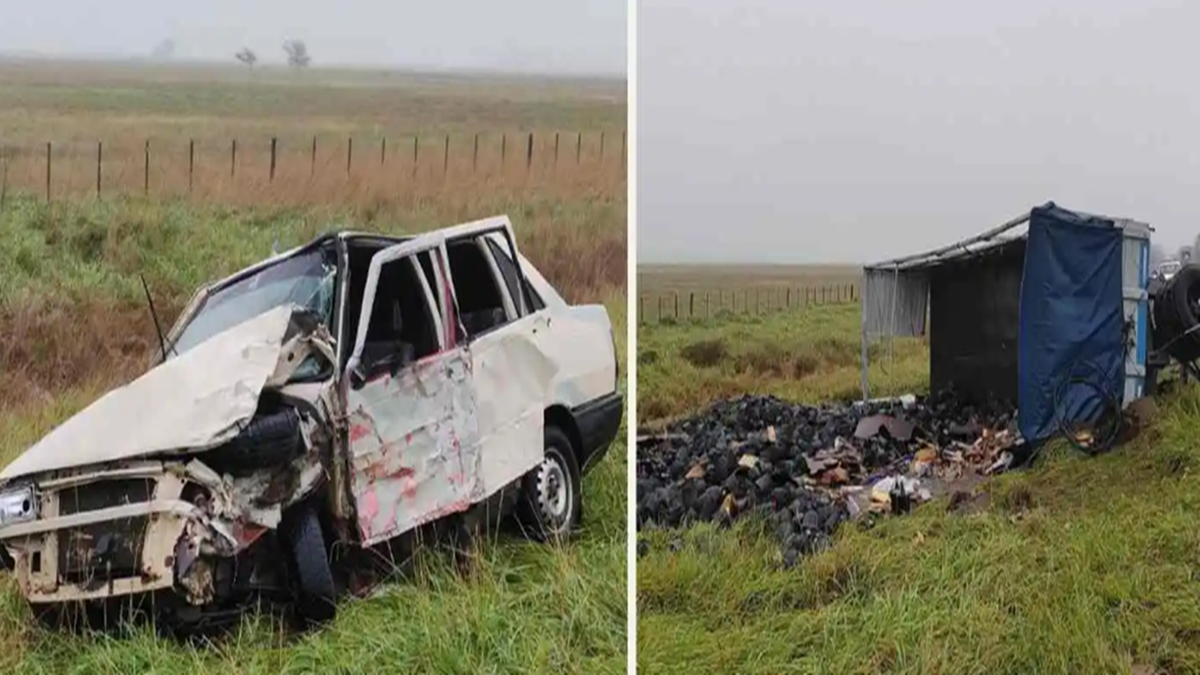 Un fuerte choque se produjo en la Ruta 60, a unos 10 kilómetros del cruce con la Ruta 3, en el partido de Azul, entre un automóvil Fiat Duna y un camión Mercedes Benz modelo 1633 que transportaba un acoplado Bonano cargado con damajuanas.