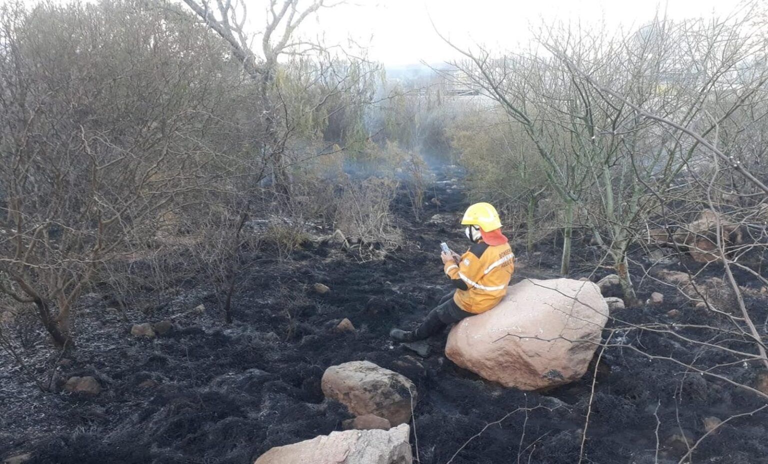 “Luego de 4 horas de trabajo, llegó el momento de la clase virtual. Sin prejuicio alguno, haciendo guardia de cenizas, en medio del pasto quemado y usando una piedra como silla, ingresó a su clase y rindió su examen de la semana”, explicó el titular de los Bomberos Voluntarios «Águilas de Acero», al destacar la labor del bombero que se conectó para dar el examen.