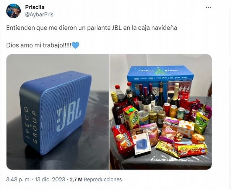Además de la diversidad de alimentos y bebidas (incluido Campari, Fernet Branca, Champagne), otro detalle que llamó la atención es que la caja también incluía un parlante JBL y un elegante juego de cubiertos Tramontina. Inmediatamente, los usuarios le preguntaron dónde trabajaba y si había alguna vacante disponible, generando una oleada de reacciones y comentarios. La joven contestó que trabaja en IVECO, en la planta que está en Córdoba.