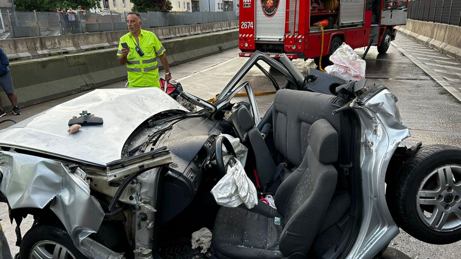 Como consecuencia de esta maniobra, el coche fue embestido por detrás por otro camión, marca Mercedes Benz, y quedó aplastado entre los dos inmensos rodados.