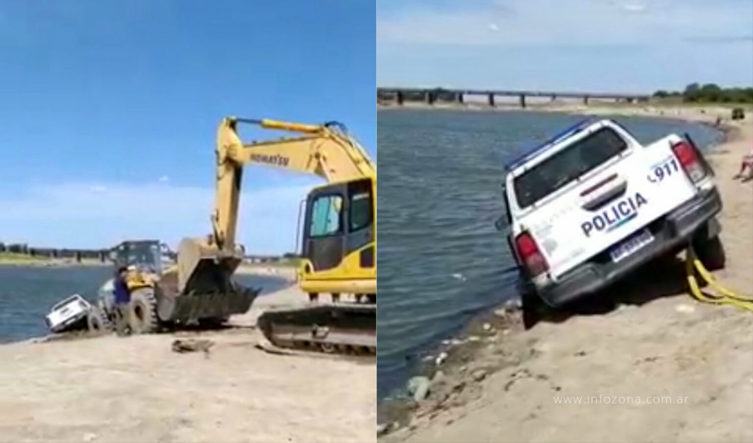 Un insólito episodio que involucró a un patrullero de la Policía Bonaerense, una camioneta particular, y una retroexcavadora ocurrió a orillas del Río Salado en un distrito bonaerense según hicieron saber en la Redacción de INFOZONA, ocasionales testigos del mismo, que además publicaron el video en un grupo de Facebook.